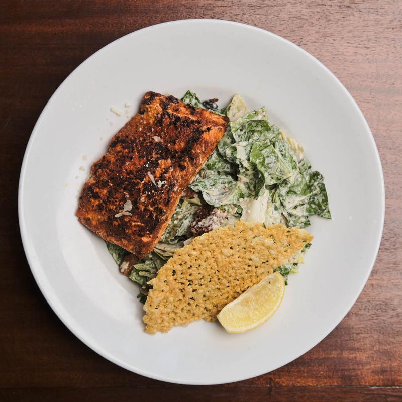 Blackened salmon served a top iceberg and romaine tossed in our homemade Caesar dressing, shaved cheese and homemade croutons.